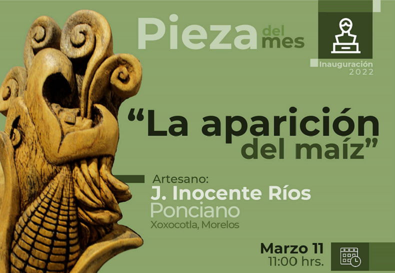 Vena disfrutar en compañía de tu familia y amigos la inaguración de la pieza del mes, la cual lleva por nombre "La aparición del maíz", elaborada por el artesano J. Inocente Ríos Ponciano.