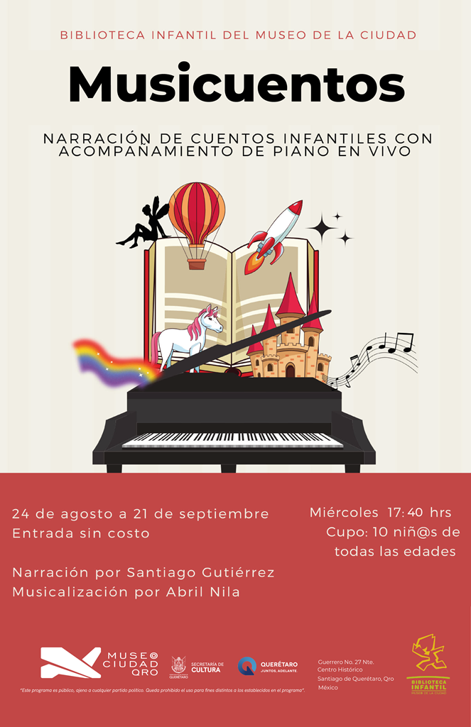 Narración de cuentos infantiles con acompañamiento de piano en vivo.