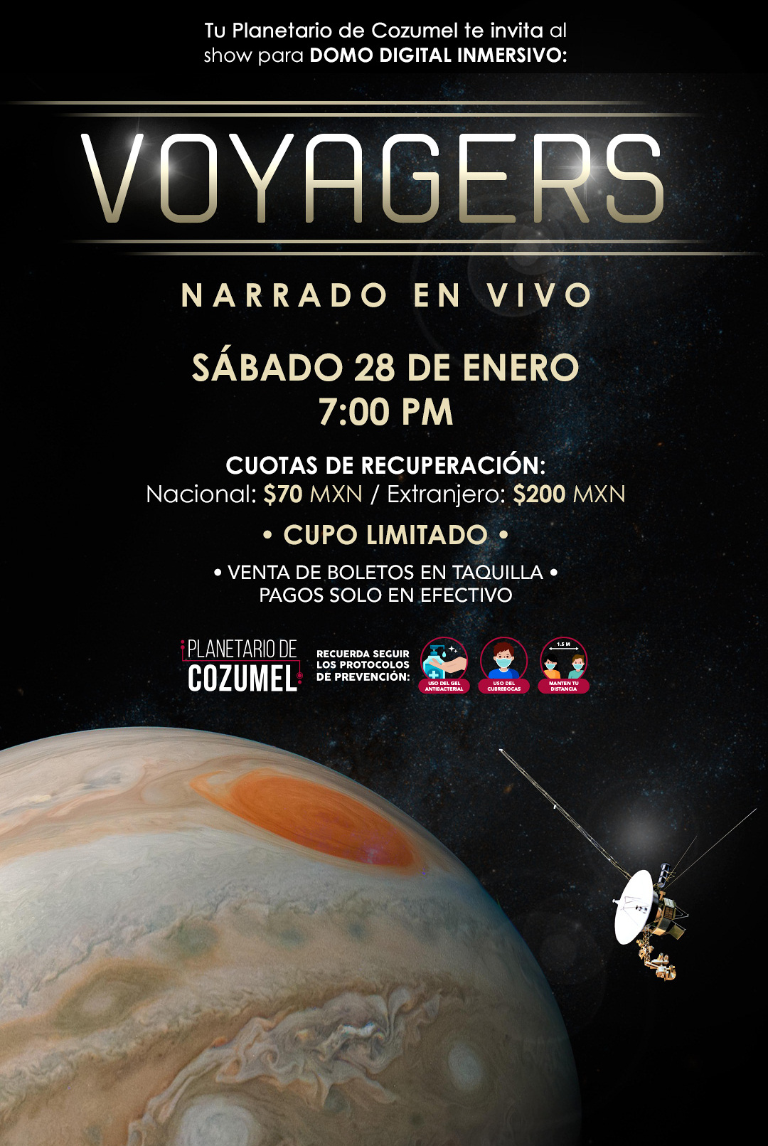Voyagers es un show, narrado en vivo, que usa la mejor tecnología de su tipo, para contar una historia de nosotros, de la humanidad. Las Voyagers fueron lanzadas a finales de los años 70's del siglo pasado y hoy se encuentran en los puntos más lejanos del Sistema Solar. Las naves son como botellas con mensajes lanzadas al Cosmos. Son, literalmente, nuestro último regalo de vuelta al Universo.