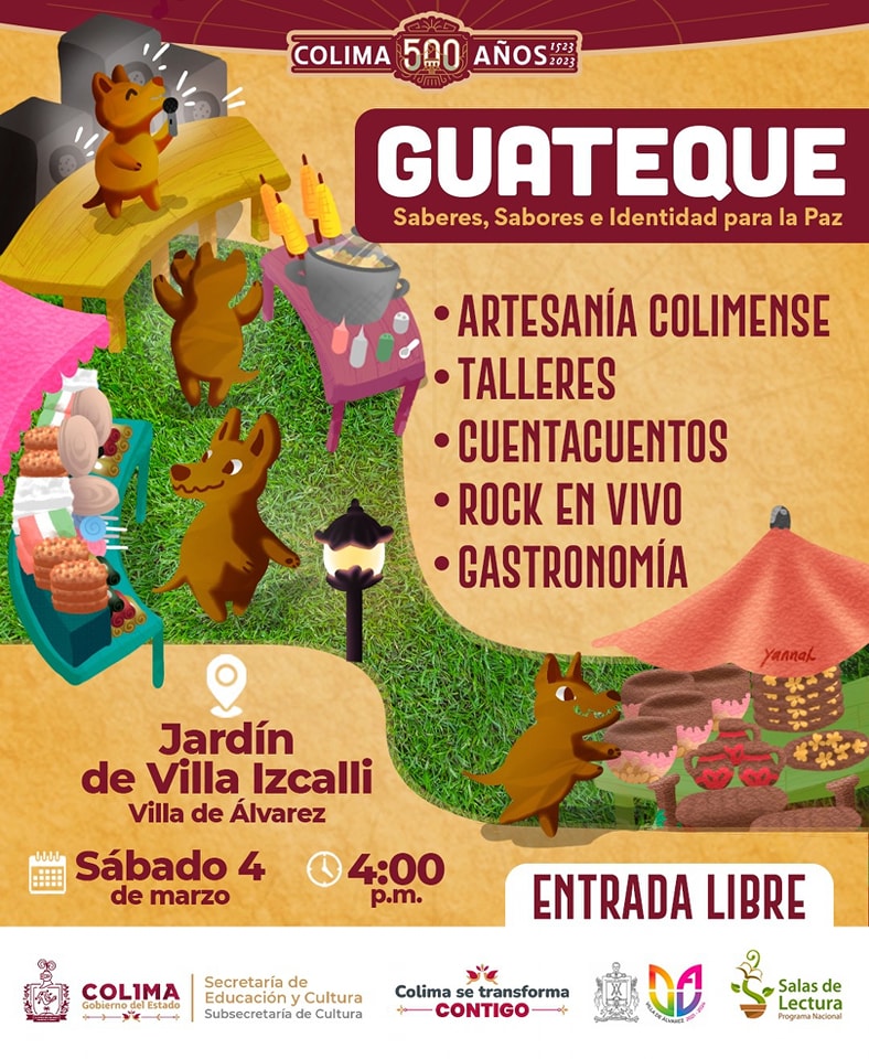 La Subsecretaría de Cultura del Gobierno de Colima, el Programa Nacional Salas de Lectura y el H. Ayuntamiento de Villa de Alvarez, te invitan a vivir la segunda edición del "Guateque: Saberes, Sabores e Identidad para la Paz", una gran fiesta de las artes para todas y todos.