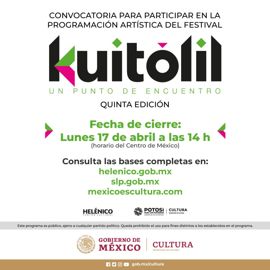 La Secretaría de Cultura del Gobierno de México, a través del Centro Cultural Helénico, y el Gobierno del estado de San Luis Potosí, a través de su Secretaría de Cultura, anuncian la convocatoria para integrar la programación artística de la quinta edición del festival Kuiltólil: un punto de encuentro para niñas, niños, bebés y jóvenes audiencias, que tendrá lugar en San Luis Potosí del 26 al 31 de agosto de 2023.