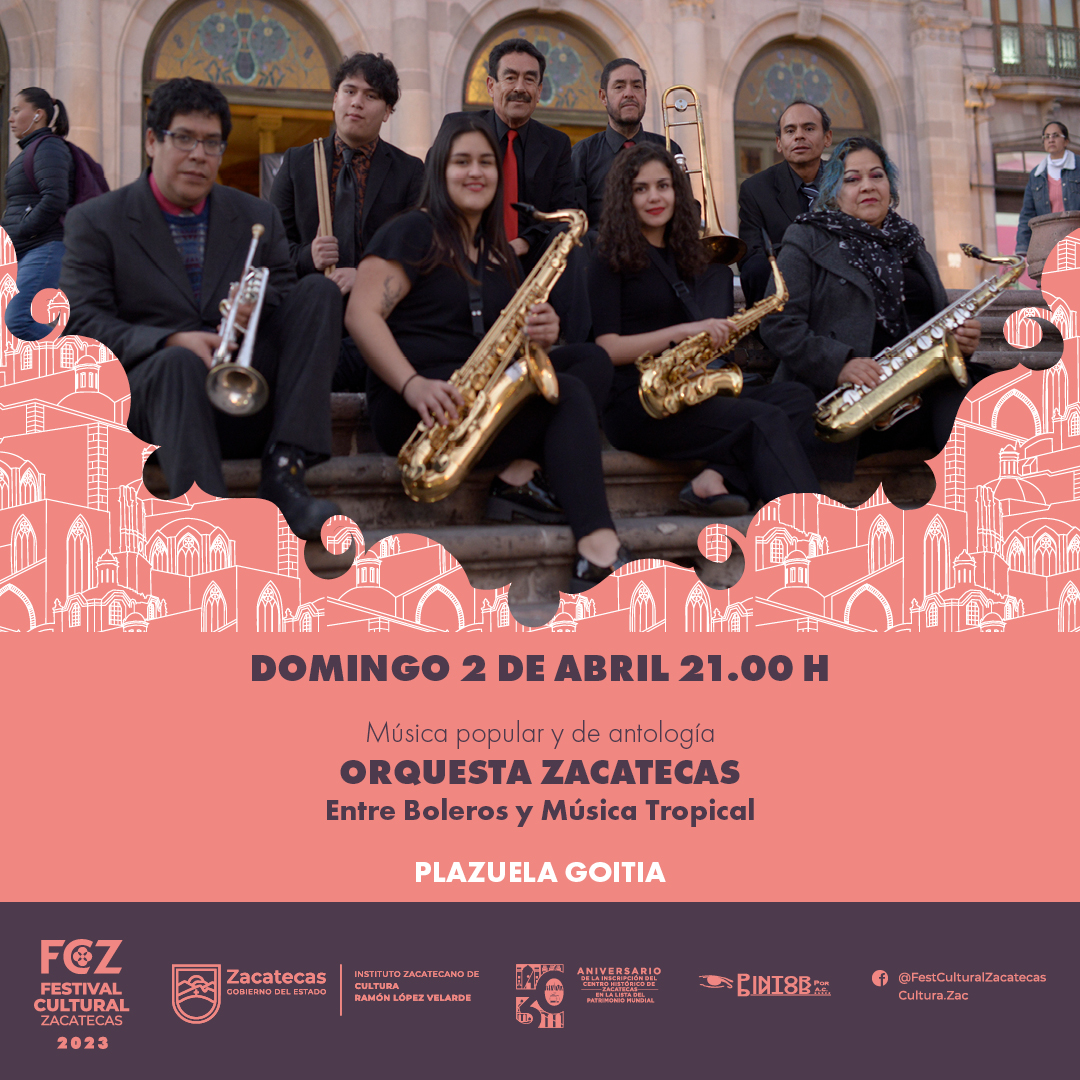En el marco del Festival Cultural Zacatecas 2023, se presenta Orquesta Zacateca, con el espectáculo musical "Entre boleros y música tropical". El Gobierno de Zacatecas, a través del Instituto Zacatecano de Cultura (IZC) "Ramón López Velarde" te invitan este domingo 2 de abril a las 21:00 horas, en la Plazuela Goitia.