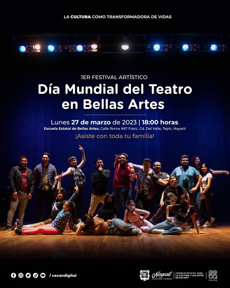 El Gobierno del Estado de Nayarit, a través del Consejo Estatal para la Cultura y las Artes y la Escuela Estatal de Bellas Artes, te invitan a celebrar con nosotros el ¡Día Mundial del Teatro!, asiste este próximo lunes con toda tu familia y disfruta de los diferentes números artísticos que hemos preparado para tí.
