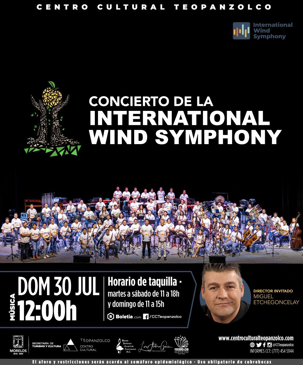 Concierto de la International Wind Symphony, que reúne a una selección de los mejores músicos de alientos y percusiones de orquesta y banda sinfónica. El director invitado es Miguel Etchegoncelay, presidente de la World Association Of Symphonic Bands and Ensambles (WASBE).