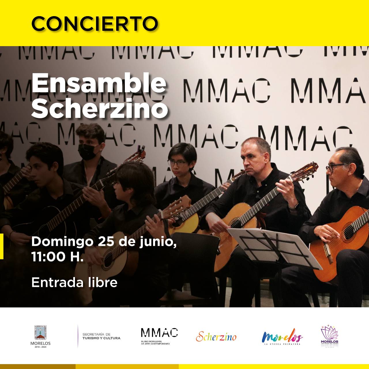 El Ensamble de Guitarras Scherzino, conformado por un grupo de niños y jóvenes morelenses dedicados a la guitarra clásica en el método Suzuki, presenta un concierto con lo más reciente de su repertorio.