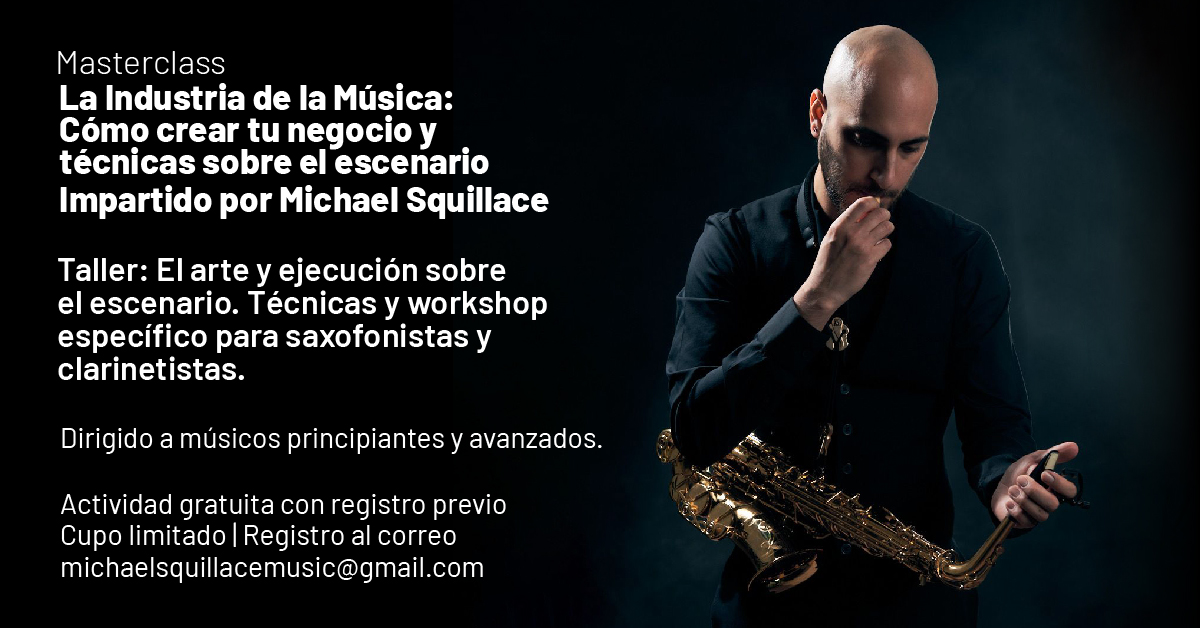 Masterclass "La industria de la música: Cómo crear tu negocio y técnicas sobre el escenario", impartida por Michael Squillace, taller acerca del arte y ejecución sobre el escenario, técnicas y workshop para saxofonistas y clarinetistas, principiantes y avanzados.