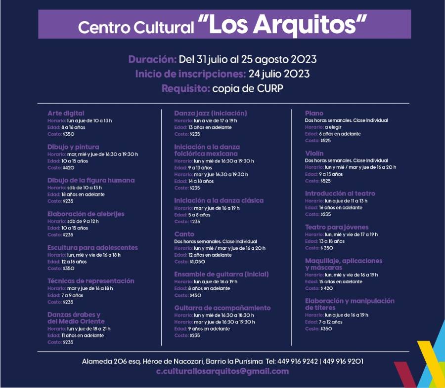 El Centro Cultural "Los Arquitos" ofrece cursos de verano de Arte digital, dibujo y pintura, dibujo de la figura humana, elaboración de alebrijes, escritura para adolescentes, ténicas de representación, danzas árabes y del medio oriente, danza jazz (iniciacion), iniciacion a la danza folclórica mexicana, iniciación a la danza clásica, canto, ensamble de guitarra (inicial), guitarra de acompañamiento, piano, violín, introducción al teatro, teatro para jóvenes, maquillaje, aplicaiones y máscaras, elaboración y manipulación de títeres.