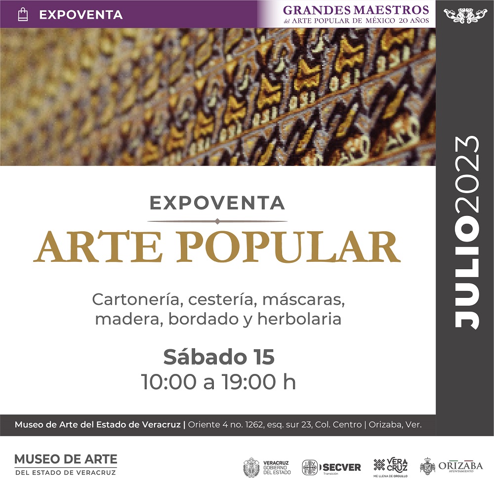 Siguiendo con las actividades de julio, se llevará a cabo la Expoventa de Arte Popular Veracruzano que tendrá lugar en el Museo de Arte del Estado de Veracruz, actividad paralela a la exposición Grandes Maestros del Arte Popular de México, 20 años, colección Fomento Cultural Citibanamex. Disfruta y adquiere el trabajo de las maestras y maestros artesanos de Veracruz