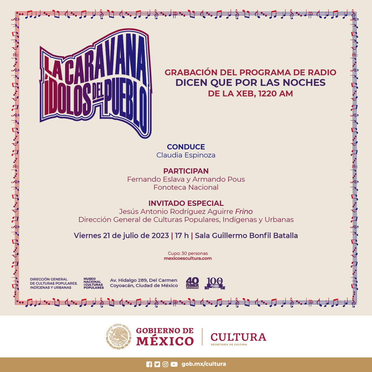 Conducido por Claudia Espinoza, estarán como invitados los investigadores de la Fonoteca Nacional Fernando Eslava y Armando Pous y el Director General de Culturas Populares, Indígenas y Urbanas, Jesús Antonio Rodríguez Aguirre “Frino”.