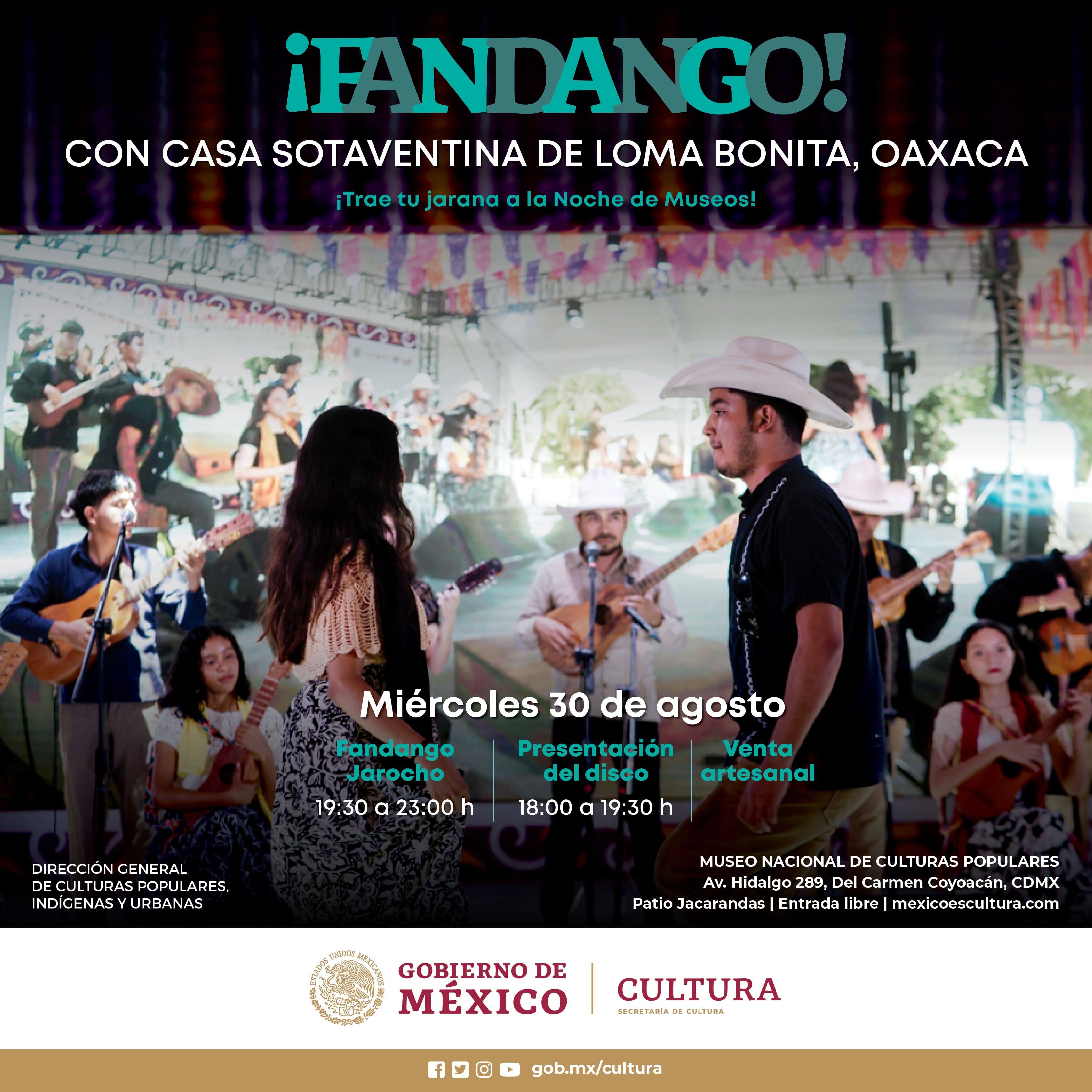 Casa Sotaventina es un espacio dedicado a la enseñanza y difusión del arte y la cultura del Sotavento Oaxaqueño. El Museo Nacional de Culturas Populares abre sus puertas a este espacio de formación de niños y jóvenes, con la presentación del disco "Casa Sotaventina de Loma Bonita Oaxaca", seguido de un tradicional fandango jarocho y una venta artesanal.