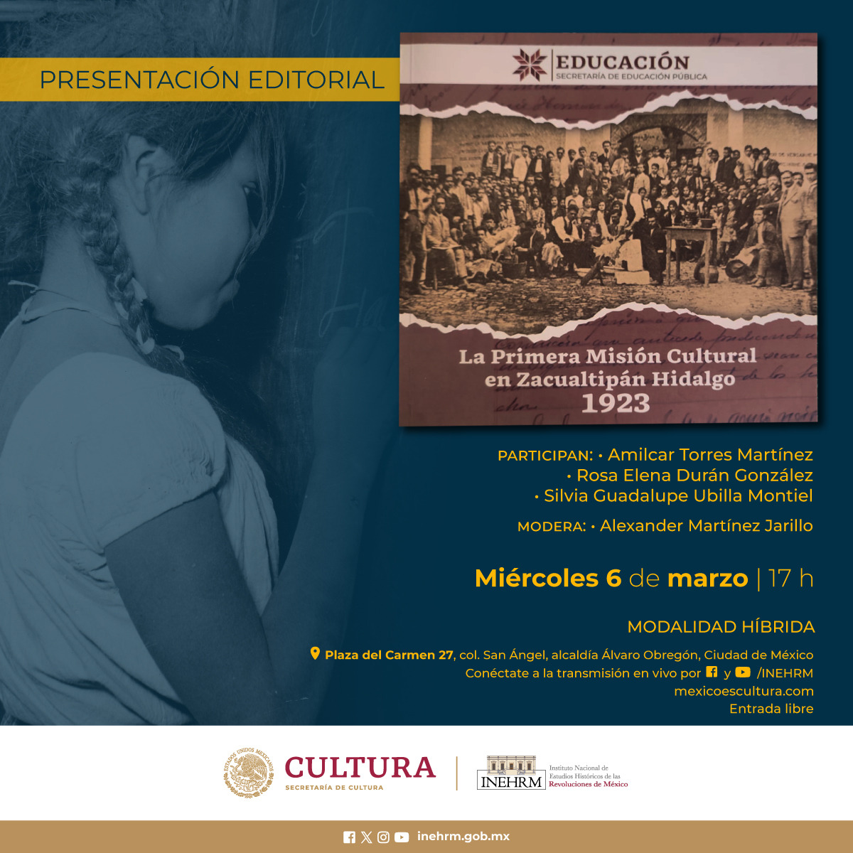 Presentación del libro: “La Primera Misión Cultural en Zacualtipán Hidalgo 1923”, Dirección de Formación Continua de la Secretaría de Educación Pública del estado Hidalgo. En esta obra versa sobre la historia de la educación en México en voz de sus autoras y autores. Para saber más ve, escucha o asiste el miércoles 6 de marzo a las 17 horas a las instalaciones del INEHRM, ubicadas en Plaza del Carmen 27, San ángel, Álvaro Obregón. Síguenos a través de Facebook (/inehrm.fanpage) o You Tube (Canal INEHRM)