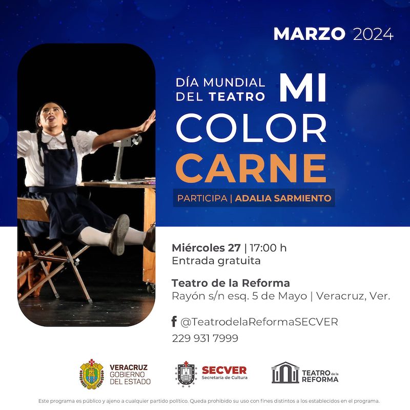 En conmemoración del Día Mundial del Teatro, se llevará a cabo la presentación de la obra teatral Mi color carne, proyecto de la artista escénica Adalia Sarmiento.