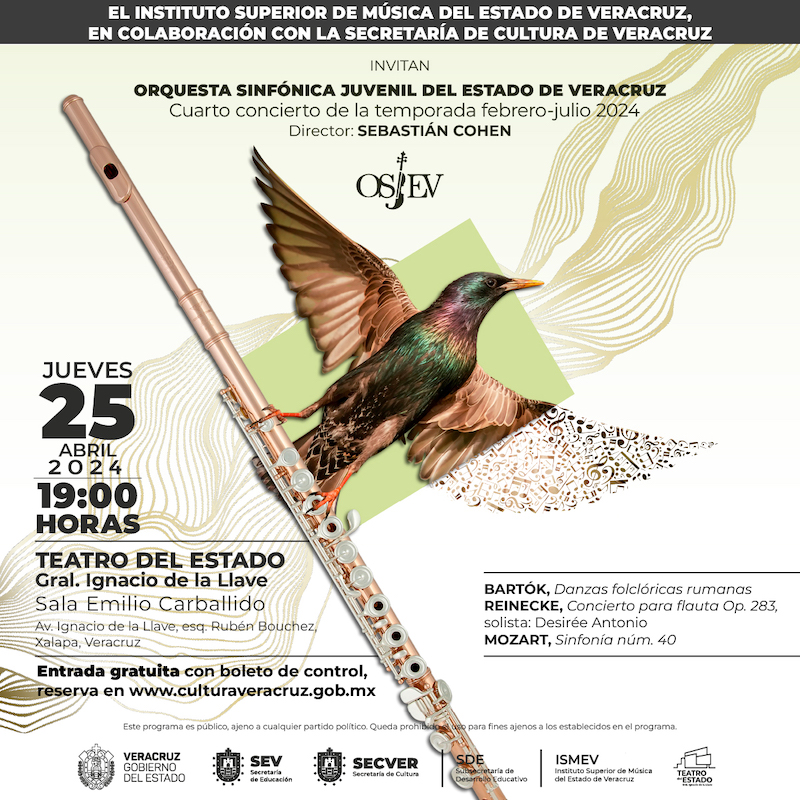 Como parte de las actividades del mes de abril, se llevará a cabo el Cuarto concierto de la temporada febrero-julio 2024 por parte de la Orquesta Sinfónica Juvenil del Estado de Veracruz, bajo la dirección de Sebastián Cohen.