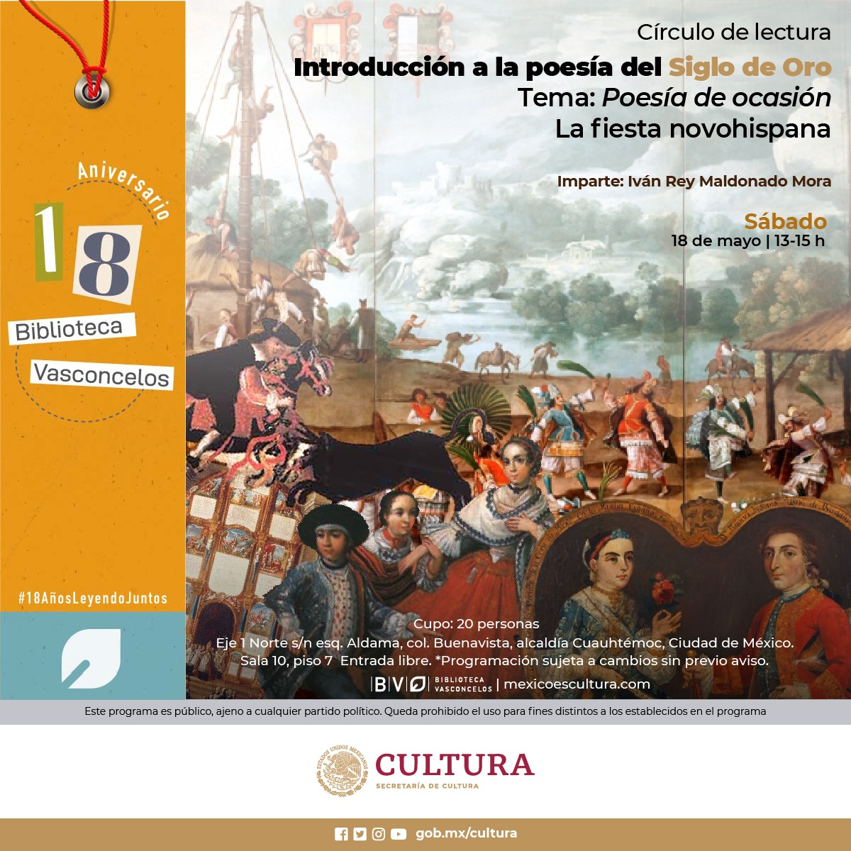 ¿Te gustaría leer poesía pero te intimida o no sabes por dónde comenzar? ¿Has escuchado hablar del Siglo de Oro español? ¡Participa en nuestro círculo de lectura y poesía! Leamos juntos algunos de los poemas más representativos de los siglos XVI y XVII. Nuestra sexta sesión estará dedicada a una interesante pero poco conocida “relación de fiesta”, escrita por la novohispana María Estrada de Medinilla, en la que relata la entrada del virrey marqués de Villena a la Ciudad de México en 1640. Conversaremos sobre la importancia de las celebraciones cívicas y religiosas en la cultura barroca, la labor literaria de María Estrada y otras novohispanas, así como de las características de este llamativo subgénero poético. ¡Te esperamos!
