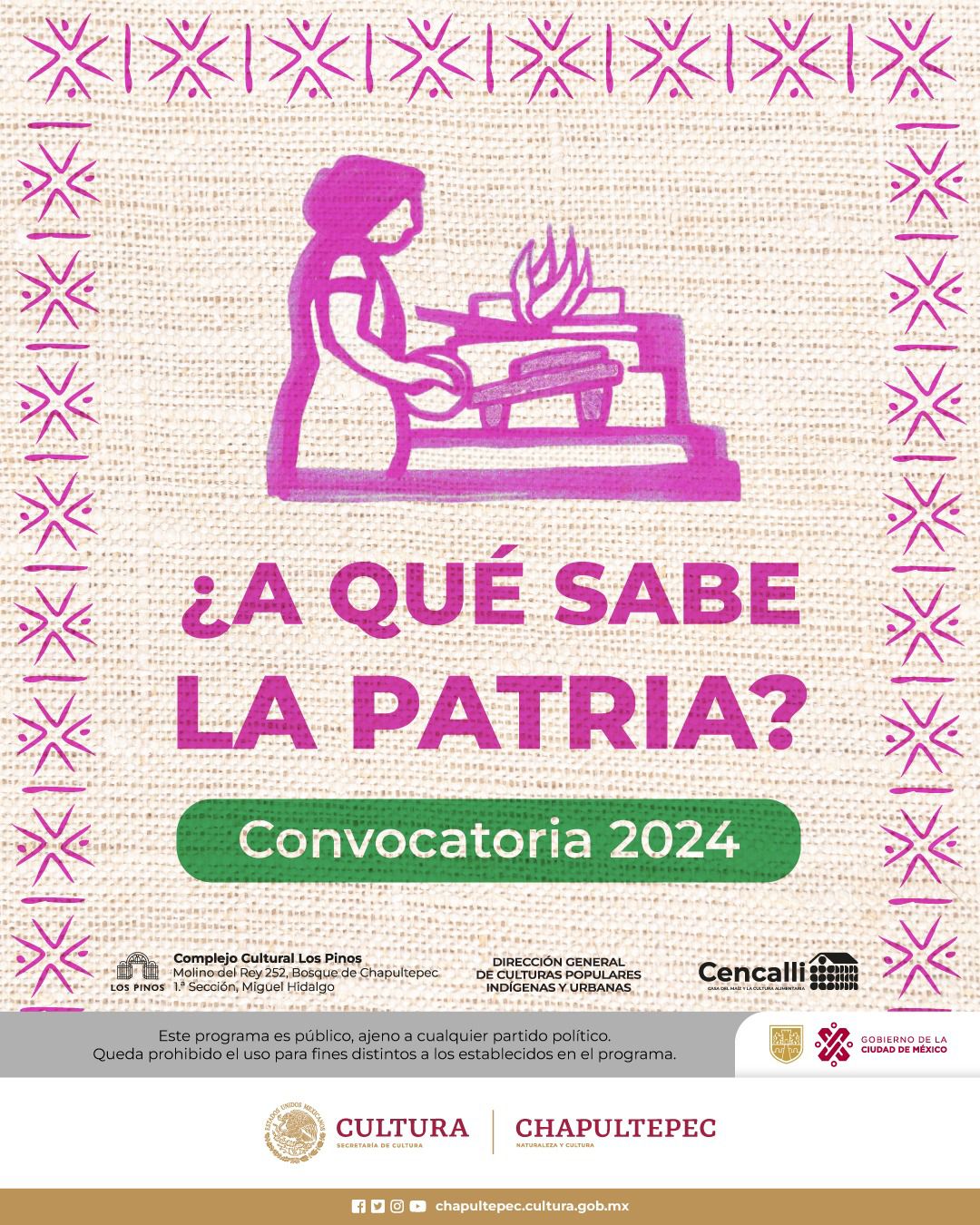 La Secretaría de Cultura, a través de la Dirección General de Culturas Populares, Indígenas y Urbanas y Cencalli, La Casa del Maíz y la Cultura Alimentaria, con apoyo del proyecto prioritario Chapultepec, Naturaleza y Cultura, invita a cocineras y cocineros a participar en el concurso a las mejores recetas de México: ¿A qué sabe la patria?