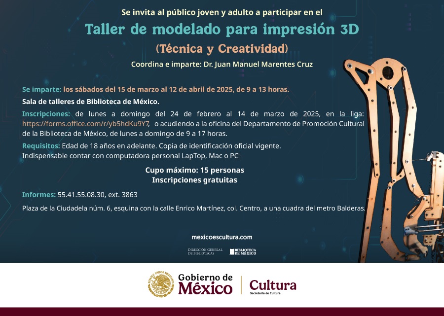 Taller cuyo objetivo es acercar a los participantes a la comprensión de los procesos propios del modelado digital orientado a la generación de archivos para la impresión 3D, así como crear en ellos una conciencia reflexiva sobre el potencial para la creación de objetos funcionales, tanto en su función mecánica como simbólica en un creciente mercado de la producción asistida por la manufactura aditiva.
