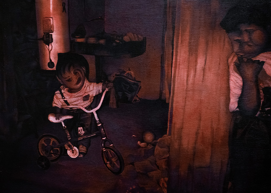 A través de la luz, la fotografía nos da claridad sobre el pasado nos da una sensación de permanencia sobre el recuerdo. La oscuridad, sin embargo, está igualmente dotada de cualidades para adentrarnos en la memoria y matizar el pasado. En Elogio del olvido Enrique Gramos experimenta con las posibilidades que le da la pintura para aproximarse al álbum fotográfico desde el olvido y la oscuridad. Utilizando tonos negros y rojos, y jugando con la distorsión de las figuras, Gramos hace un guiño hacia lo engañoso de la fotografía, enfatizando la naturaleza difusa que el tiempo imprime en la memoria, y subrayando que el olvido es inherente al recuerdo.