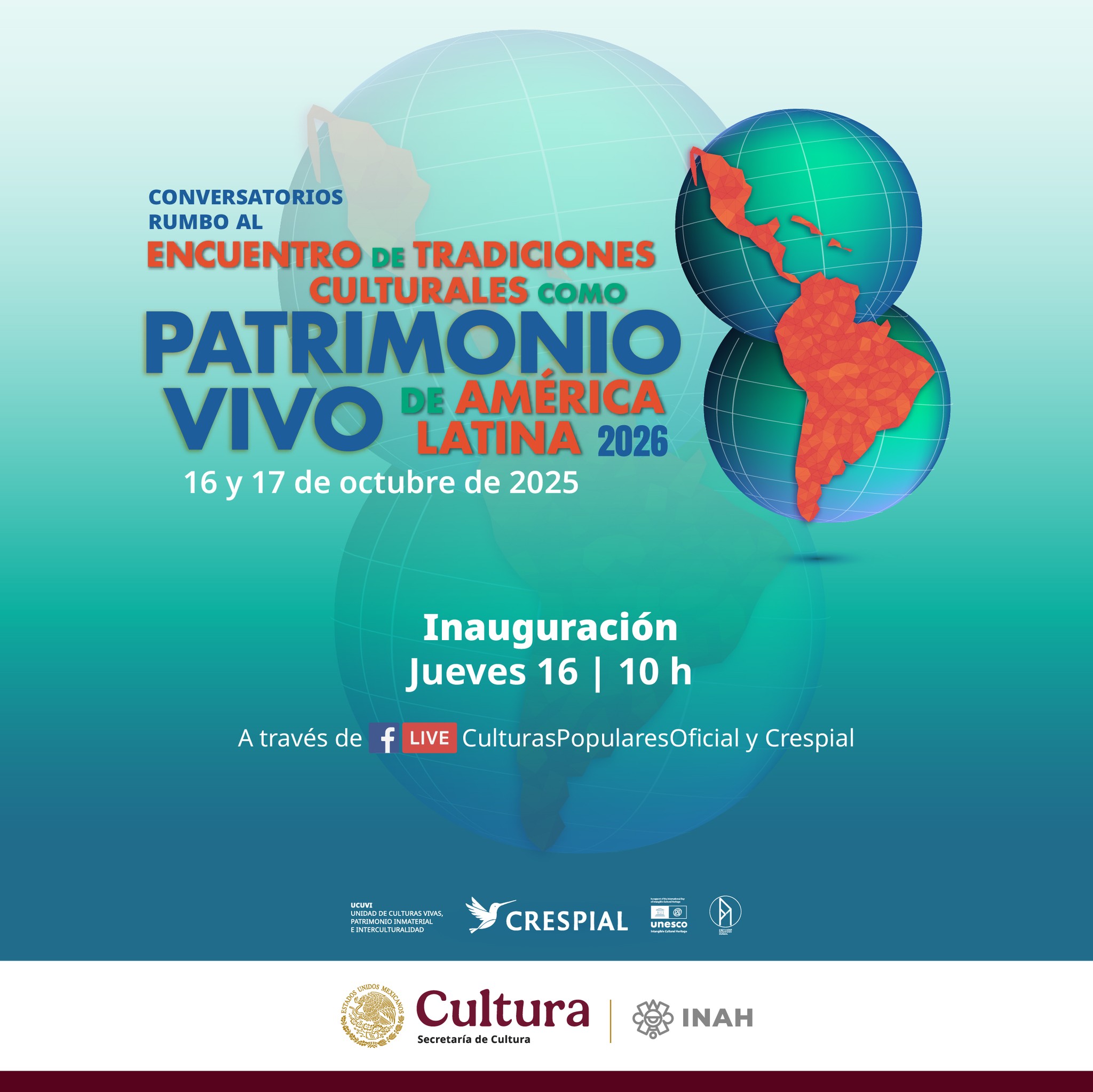 En el marco del Día Internacional del Patrimonio Cultural Inmaterial (PCI) (17 de octubre), la Secretaría de Cultura de México (a través de UCUVI), el INAH (Dirección de Patrimonio Mundial) y CRESPIAL convocan a los conversatorios virtuales "Rumbo al Encuentro de Tradiciones Culturales como Patrimonio Vivo de América Latina 2026".