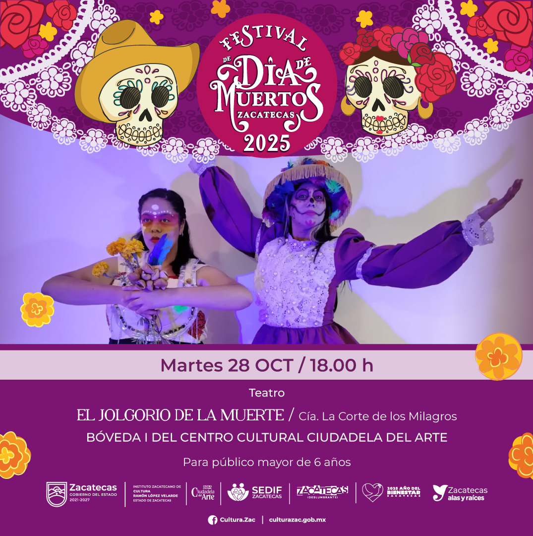 No te pierdas “El jolgorio de la muerte”, una puesta en escena de la Compañía La Corte de los Milagros, dentro del Festival de Día de Muertos 2025. Una celebración llena de color, tradición y teatro que rinde homenaje a nuestras raíces.
