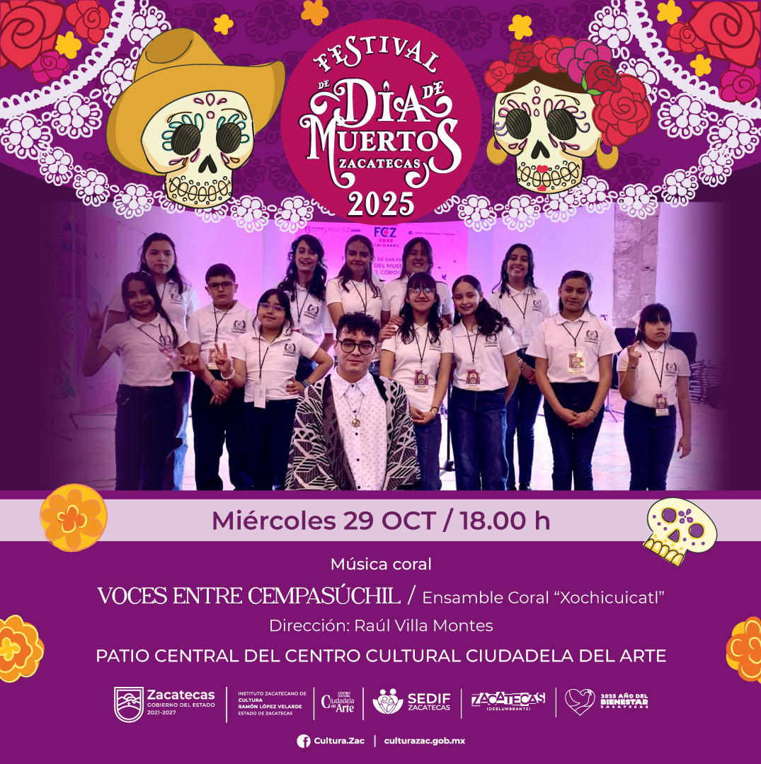 Disfruta la presentación del Ensamble Coral “Xochicuicatl” con su espectáculo “Voces entre cempasúchil”, una propuesta que celebra la vida y la memoria a través de la música.