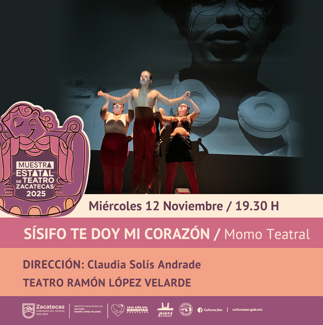 En el marco de la Muestra Estatal de Teatro Zacatecas 2025, la compañía Momo Teatro presenta la obra “Sísifo, te doy mi corazón”, dirigida por Claudia Solís. Una puesta en escena profunda que combina talento, simbolismo y emoción. ¡No te la pierdas!