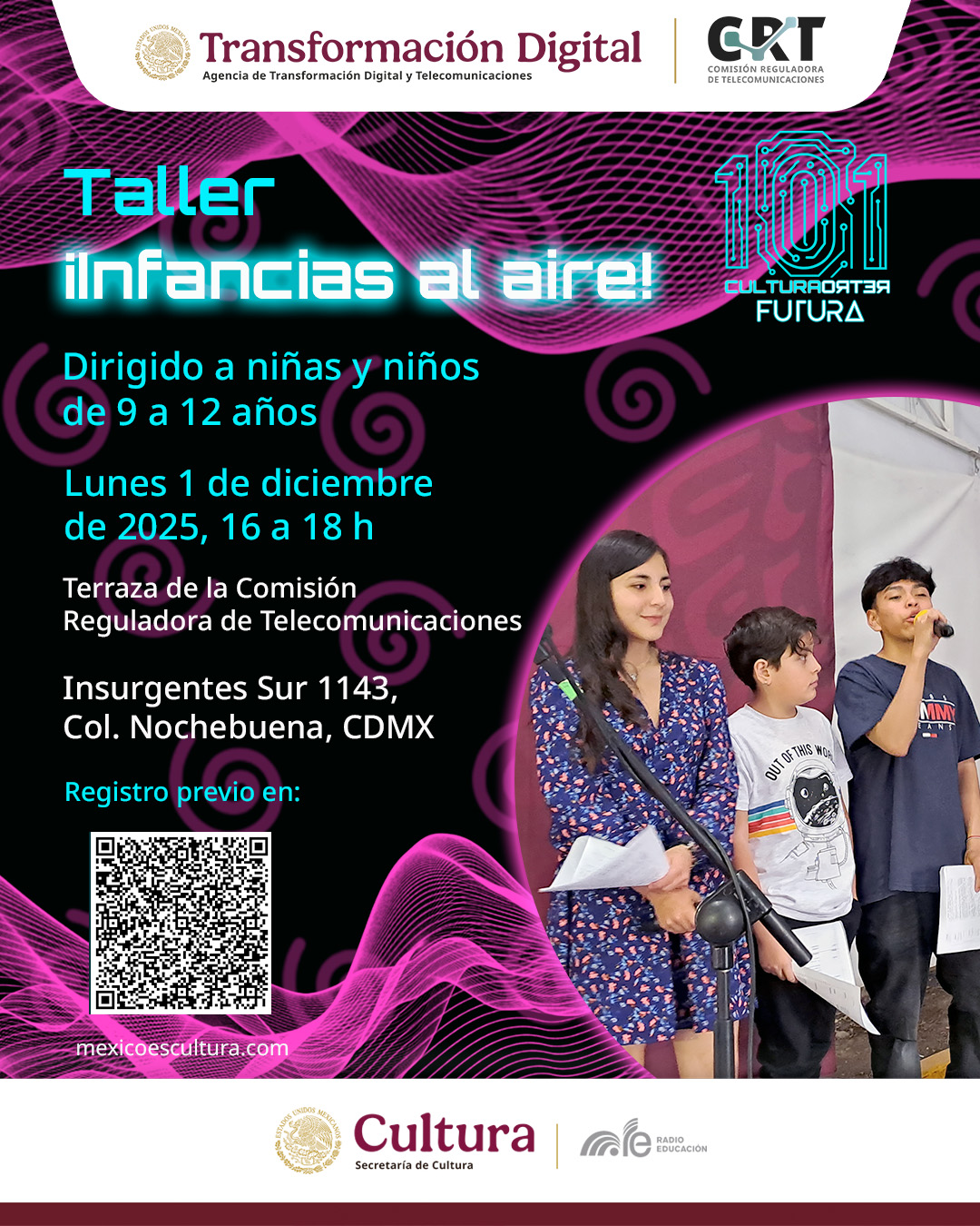 Se impartirá el taller “¡Infancias al aire!”, dirigido a niñas y niños de 9 a 12 años, cuyo objetivo es que conozcan la radio, sus elementos y cómo se realiza un programa de radio, a través de su participación en una mini cápsula.