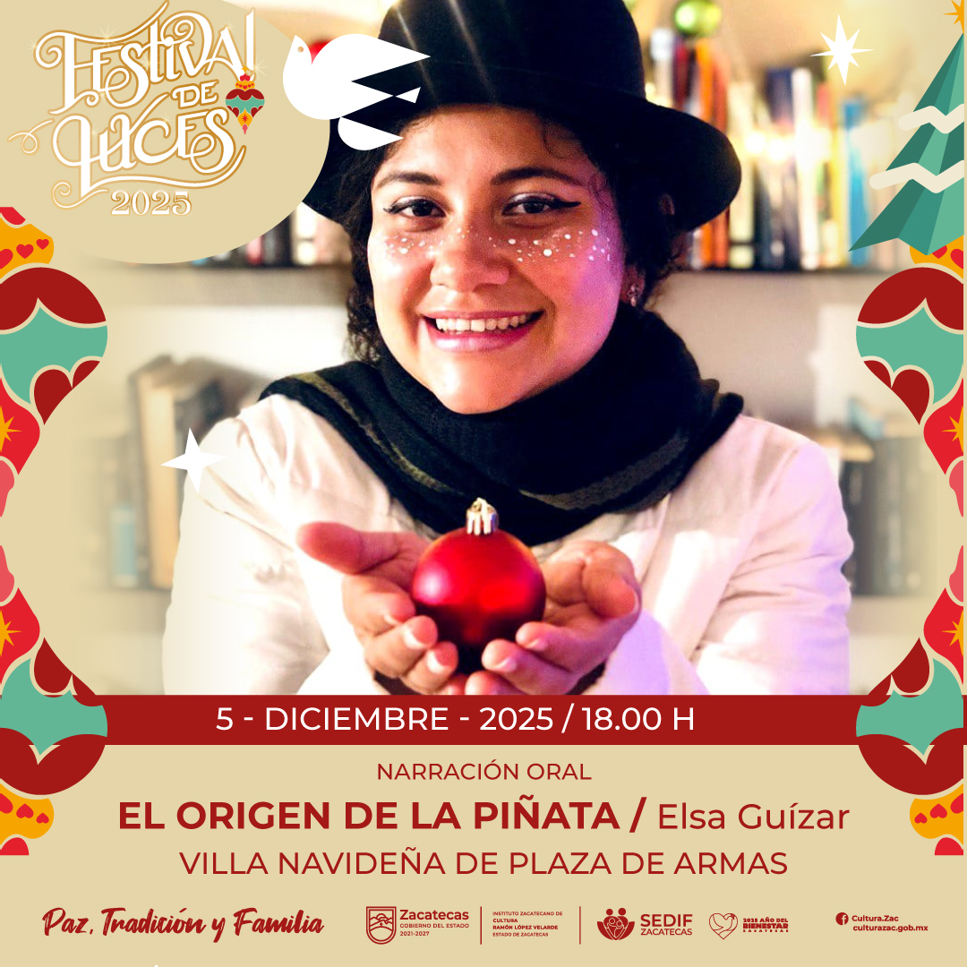 La Villa Navideña de Plaza de Armas será escenario del espectáculo de narración oral “El origen de la piñata”, a cargo de la narradora Elsa Guízar. Una propuesta que busca rescatar la tradición y el simbolismo de este elemento tan representativo de las celebraciones mexicanas.