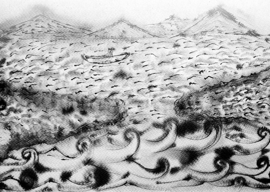 “Mar muerto” es una carpeta integrada por cinco piezas del maestro Sabino López, impresas en risografía. Estas obras surgieron a partir de la serie de poemas Mar muerto de Alan Vargas, estableciendo un diálogo entre la gráfica y la palabra. La curaduría del proyecto estuvo a cargo de Ángel Morales, mientras que la impresión y el diseño fueron realizados en Cuatro Triángulos, laboratorio editorial.