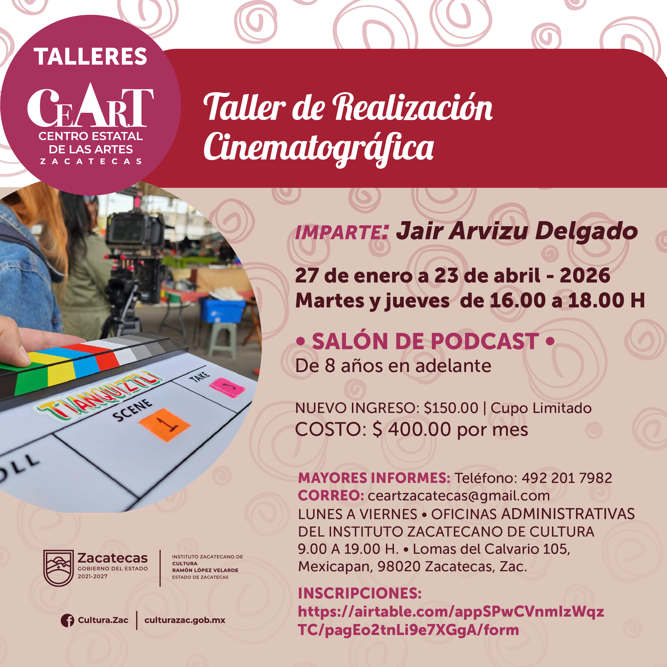 Participa en el Taller de Realización Cinematográfica, impartido por Jair Arvizu Delgado, un espacio formativo diseñado para quienes desean comprender y desarrollar los procesos creativos y técnicos del cine. La actividad se llevará a cabo en el CEART Zacatecas y está dirigida a estudiantes, creadores y público interesado en la producción audiovisual. Una oportunidad para fortalecer habilidades, intercambiar ideas y acercarse al cine desde la práctica y la reflexión.