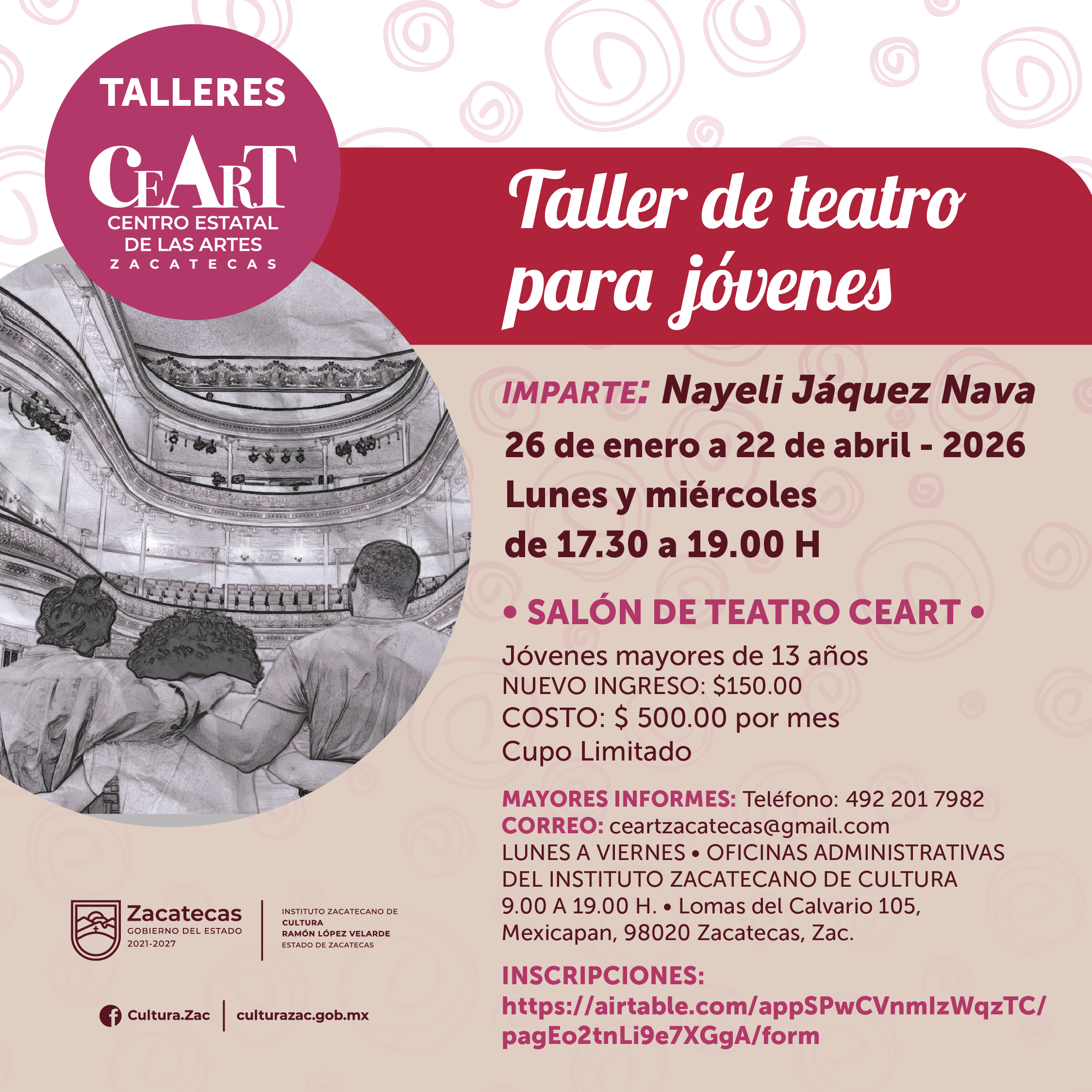 El CEART Zacatecas invita a jóvenes interesados en las artes escénicas a participar en el Taller de Teatro para Jóvenes, impartido por Nayeli Jáquez Nava. Un espacio formativo que fomenta la creatividad, el trabajo en equipo y el desarrollo de habilidades expresivas a través del teatro. Una oportunidad para explorar el escenario como herramienta de comunicación, reflexión y crecimiento personal.