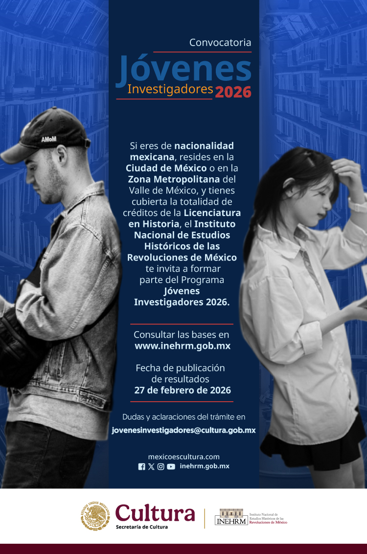 La convocatoria Jóvenes Investigadores 2026 está dirigida a jóvenes de nacionalidad mexicana, con una edad máxima de 29 años, quienes comprueben contar con el 100% de créditos de la Licenciatura en Historia, residentes en Ciudad de México, en su área metropolitana, con interés en obtener uno de los ocho estímulos económicos del programa.