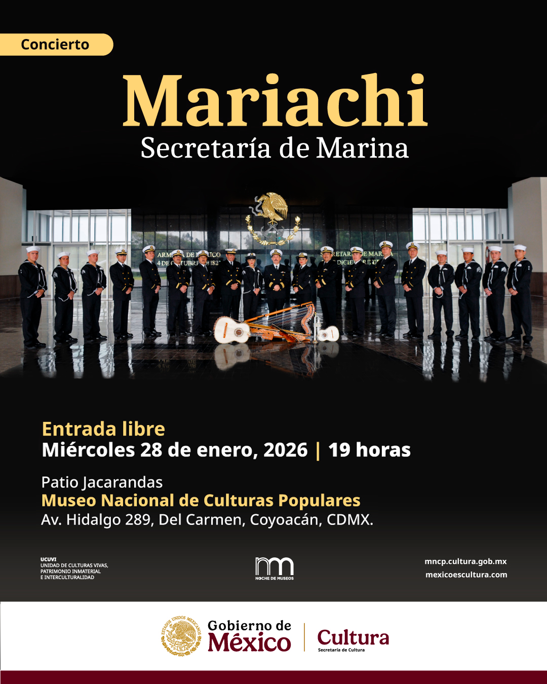 La música mexicana se hace presente en una Noche de Museos con el Mariachi de la Secretaría de Marina, una agrupación que interpreta sones, huapangos, boleros y repertorio tradicional que forma parte de nuestra identidad cultural.