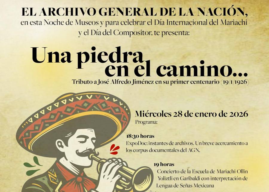 En el marco del centenario del natalicio de José Alfredo Jiménez y del Día Internacional del Mariachi, te invitamos a disfrutar de la primera noche de museos del año en el AGN, acompañados de la Escuela de Mariachi en Garibaldi y de la Escuela de Danza de la Ciudad de México -ambos del Centro Cultural Ollin Yoliztli-.