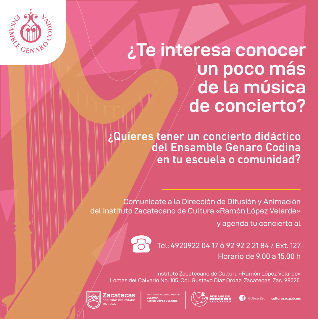 Si te interesa conocer más sobre la música de concierto o llevar un concierto didáctico del Ensamble Genaro Codina a tu escuela o comunidad, esta es una oportunidad para acercarte a la música desde una experiencia formativa, accesible y enriquecedora. Una propuesta pensada para públicos de todas las edades, que fomenta el interés cultural y el aprendizaje musical.