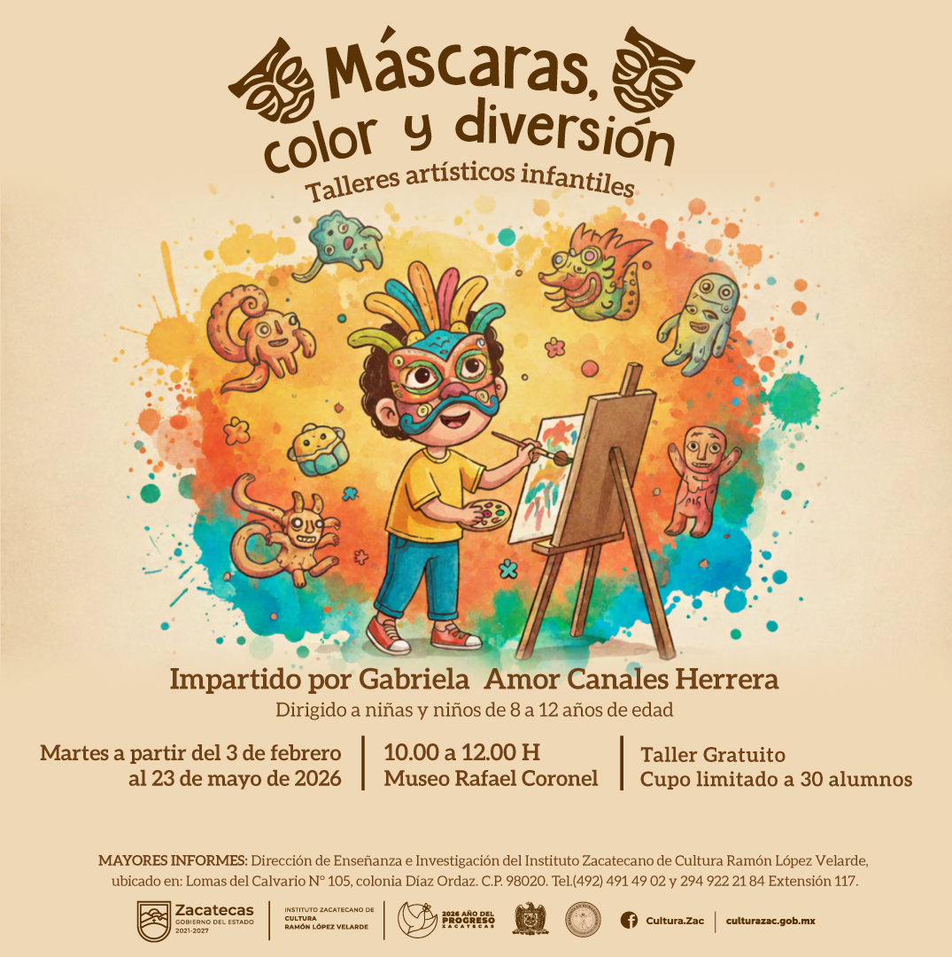 Invitamos a niñas y niños de 8 a 12 años a participar en los Talleres Artísticos Infantiles: “Máscaras, color y diversión”, impartidos por Gabriela Amor Canales Herrera, en el Museo Rafael Coronel. Una experiencia pensada para estimular la imaginación, el juego creativo y el acercamiento al arte en un entorno cultural que inspira y educa. Ideal para que las infancias exploren nuevas formas de expresión mientras se divierten.