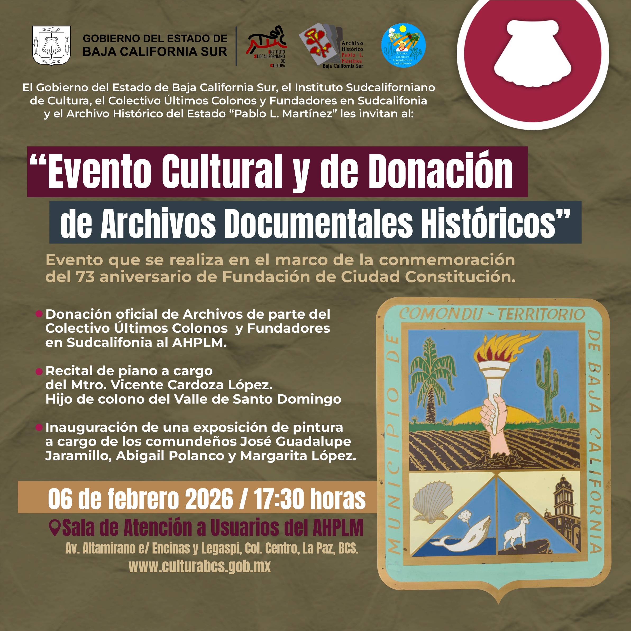 El Gobierno del Estado de Baja California Sur, el Instituto Sudcaliforniano de Cultura, el Colectivo Últimos Colonos y Fundadores en Sudcalifonia y el Archivo Histórico del Estado “Pablo L. Martínez” les invitan al “Evento Cultural y de Donación de Archivos Documentales Históricos”.