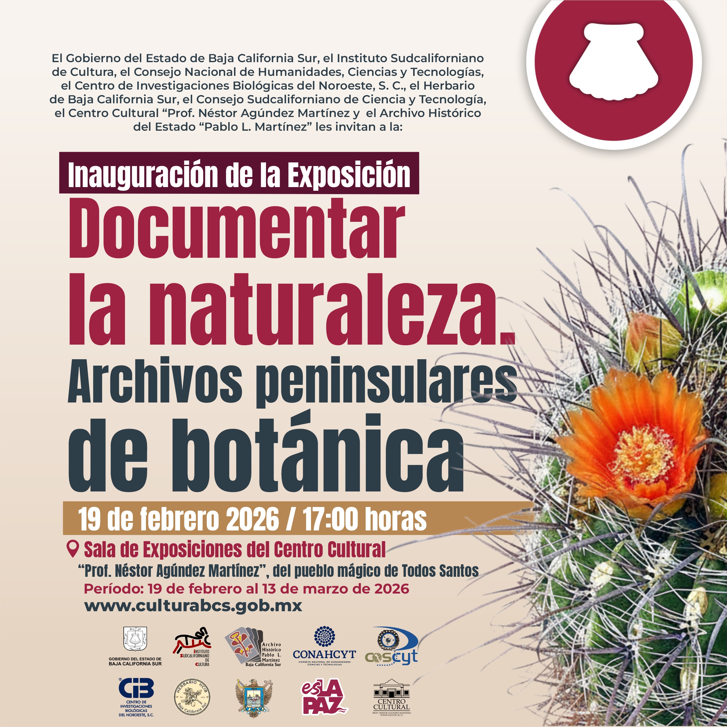 El Gobierno del Estado de Baja California Sur, el Instituto Sudcaliforniano de Cultura, el Consejo Nacional de Humanidades, Ciencias y Tecnologías, el Centro de Investigaciones Biológicas del Noroeste, S. C., el Herbario de Baja California Sur, el Consejo Sudcaliforniano de Ciencia y Tecnología, el Centro Cultural “Prof. Néstor Agúndez Martínez” y el Archivo Histórico del Estado “Pablo L. Martínez” les invitan a la inauguración de la exposición fotográfica “Documentar la naturaleza. Archivos peninsulares de botánica”.