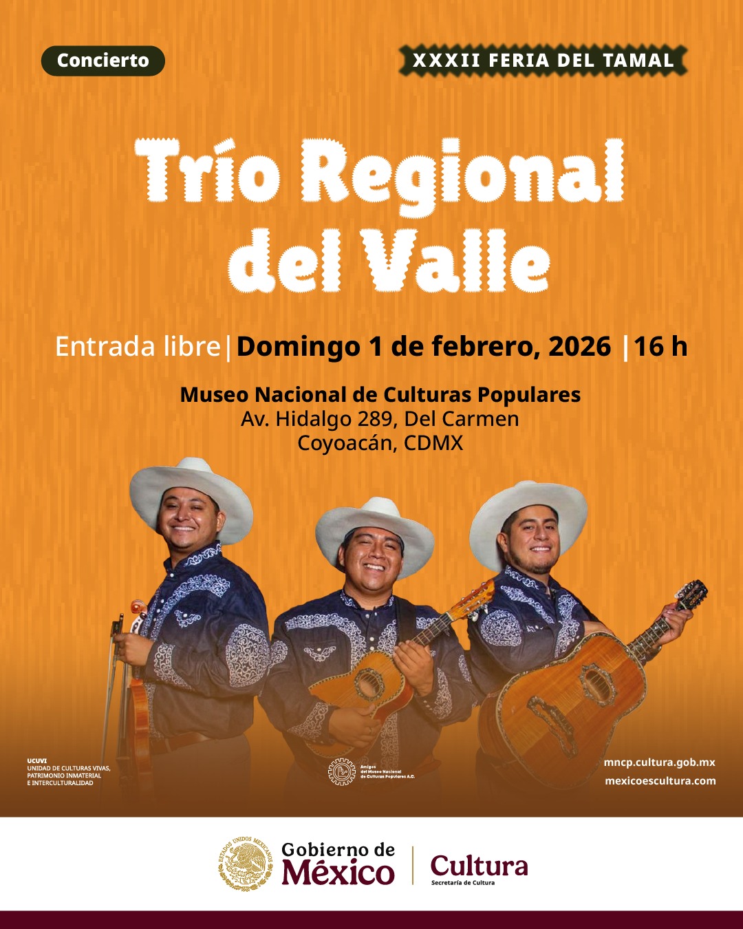 Concierto del grupo Regional del Valle, una propuesta musical que retoma y difunde la música tradicional mexicana a través de interpretaciones que evocan las raíces, la identidad y la vida comunitaria. El programa ofrece un recorrido sonoro por distintos estilos del repertorio regional, destacando la riqueza cultural y la vigencia de estas expresiones musicales en el contexto actual. Son huasteco te invita a cantar y bailar. Huapangos, sones y cumbias que laten con el corazón de México. Una fiesta musical para toda la familia en la XXXII Feria del Tamal del Museo Nacional de Culturas Populares.