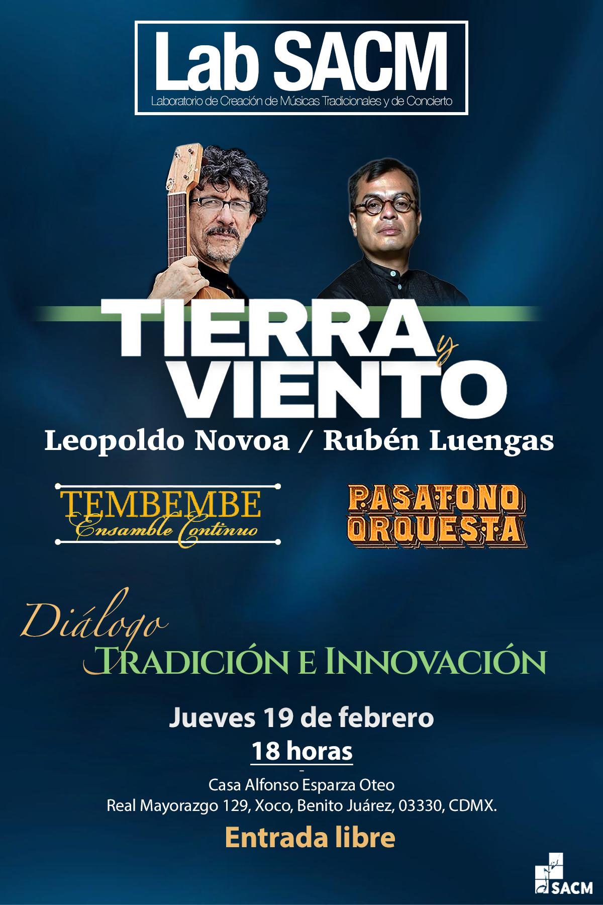 La Sociedad de Autores y Compositores de México y el Laboratorio de Creación de Músicas Tradicionales y de Concierto tienen el honor de extenderles una cordial invitación para asistir al Diálogo Tradición e Innovación con Leopoldo Novoa y Rubén Luengas.