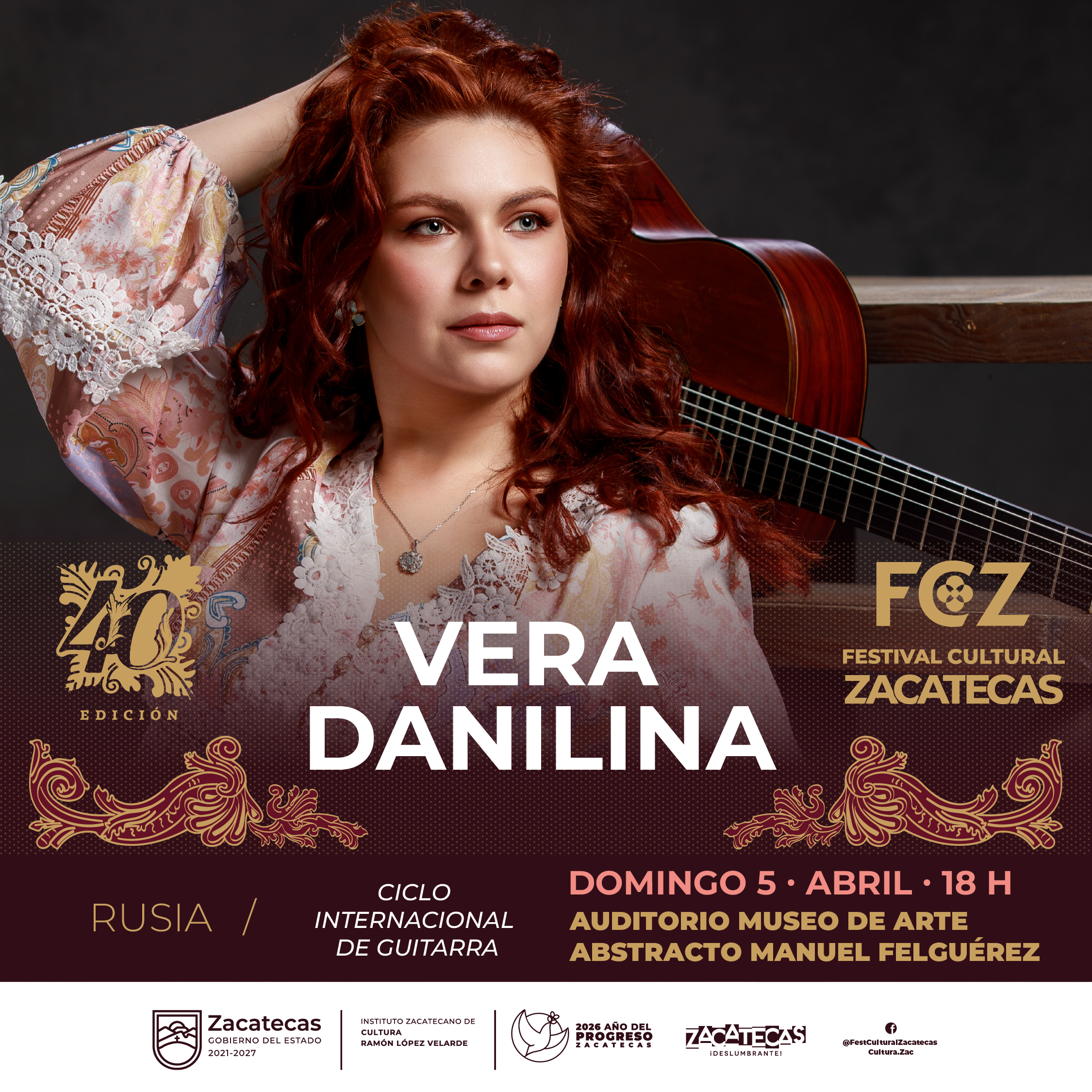 Vera Danilina, reconocida intérprete internacional, se presenta en concierto como parte del Ciclo Internacional de Guitarra del Festival Cultural Zacatecas 2026. Una cita imperdible para quienes disfrutan de la música con técnica, sensibilidad y proyección global. Una tarde que celebra el talento y el diálogo cultural a través de las cuerdas.