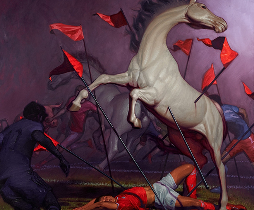 La propuesta artística de Fabián Chairez (Tuxtla Gutiérrez, 1987) está atravesada por el contexto histórico y social de inicios de los 2000 en la región fronteriza de Tuxtla Gutiérrez en Chiapas, un periodo en el que manifestaciones políticas y estéticas en torno al género y sexualidad se hicieron presentes. En este sentido, podríamos definir la trayectoria del artista en tres periodos importantes: por un lado, la exploración plástica del retrato desde la erotización del cuerpo homosexual afeminado; por el otro, la elaboración de narrativas pictóricas en torno al cuerpo racializado a partir de la iconografía de las mariconas morenas y la iconoclasia de personajes del mundo androcéntrico; a su vez, la selección presente en esta exposición que materializa la exploración y creación de un submundo de ficciones y narrativas que surgen de la apropiación hacia una cultura rígida como el fútbol.