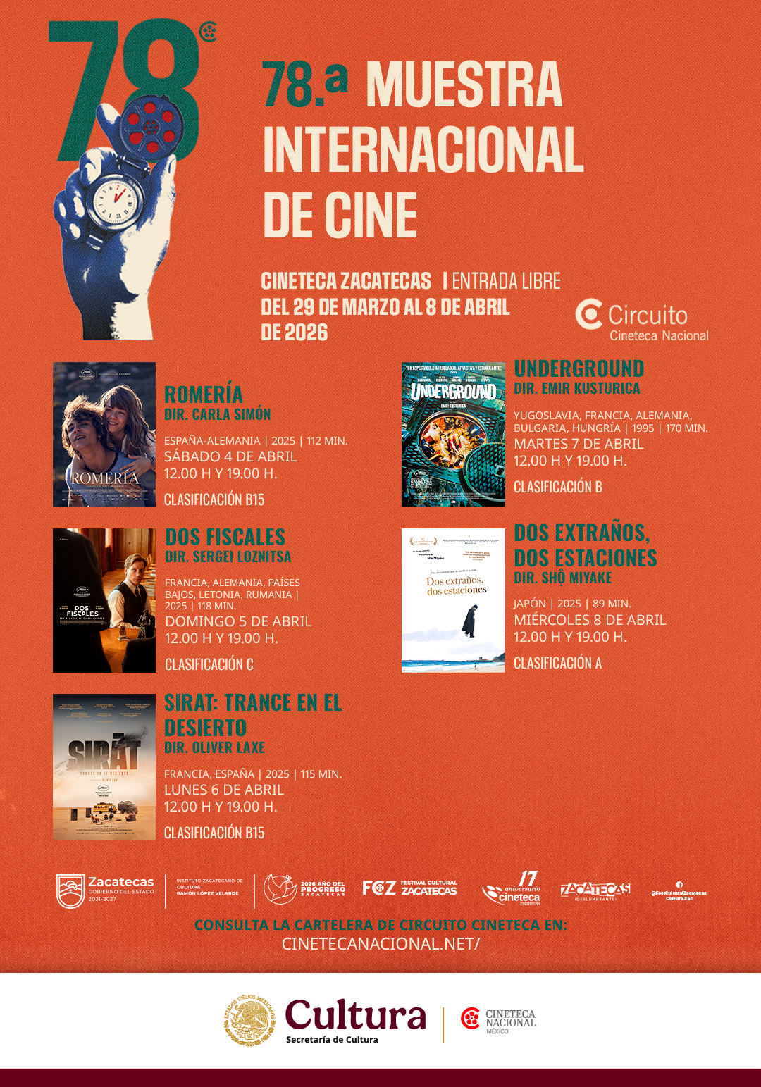 Disfruta de las proyecciones de la 78.a Muestra Internacional de Cine, como parte del circuito de la Cineteca Nacional.Una selección cinematográfica que reúne historias, miradas y propuestas de distintas partes del mundo llega a la pantalla para acercar al público a lo mejor del cine contemporáneo. Esta muestra representa una oportunidad para descubrir narrativas distintas, reflexivas y de gran calidad artística. Consulta la cartelera, elige tu función y sé parte de esta experiencia cultural que conecta al público con el cine internacional.