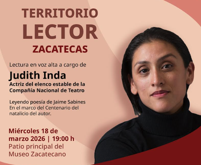 Como parte del programa Territorio Lector Zacatecas, la actriz Judith Inda, integrante del elenco estable de la Compañía Nacional de Teatro, ofrecerá una lectura especial de poesía del reconocido autor Jaime Sabines. Una experiencia íntima que invita a redescubrir la fuerza, sensibilidad y profundidad de uno de los poetas más queridos de México. El encuentro propone acercar la literatura al público a través de la interpretación escénica y la emoción de la palabra hablada. Una oportunidad para escuchar la poesía desde otra dimensión y celebrar el poder de la lectura.