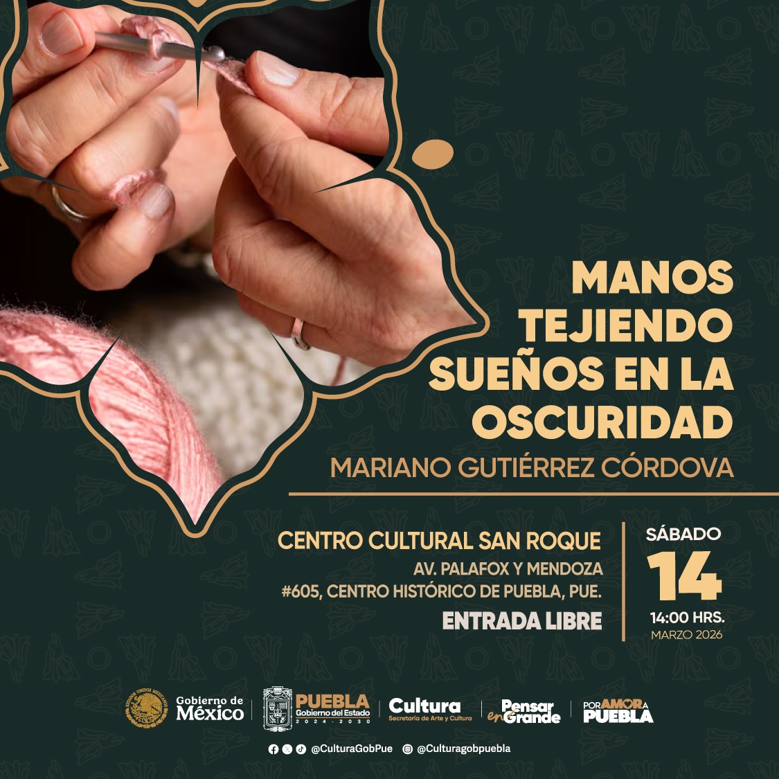 La secretaria de Arte y Cultura de Puebla te invita a ser parte de este taller enfocado en el bello arte de tejer, aprendiendo tecnicas y conociendo la estructura de un buen ambiente de paz