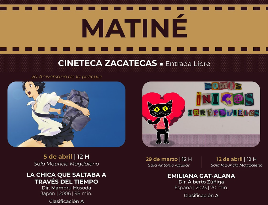 La matiné del 40 Festival Cultural Zacatecas 2026 ofrecerá una experiencia cinematográfica que conectará generaciones y sensibilidades. Se proyectarán Emiliana Gat y Alana, obras del director Alberto Zúñiga, junto a la aclamada cinta La chica que saltaba a través del tiempo de Mamoru Hosoda. Este encuentro apostará por el arte audiovisual como un espacio de reflexión y entretenimiento accesible para todo público.