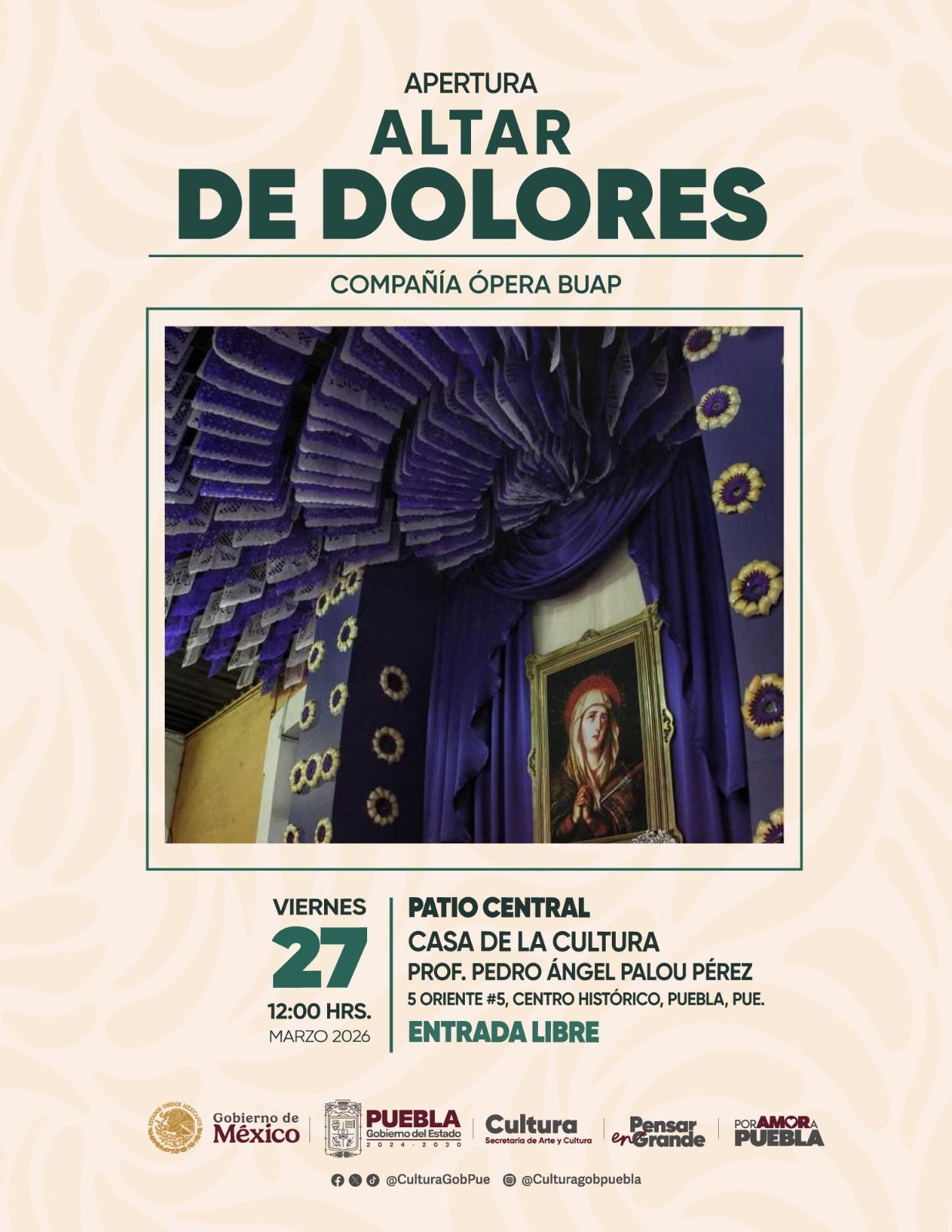 La Secretaria de Arte y Cultura te invita a la apertura del Altar de Dolores, en compañía de Ópera BUAP. Te esperamos el viernes 27 de marzo en la Casa de la Cultura