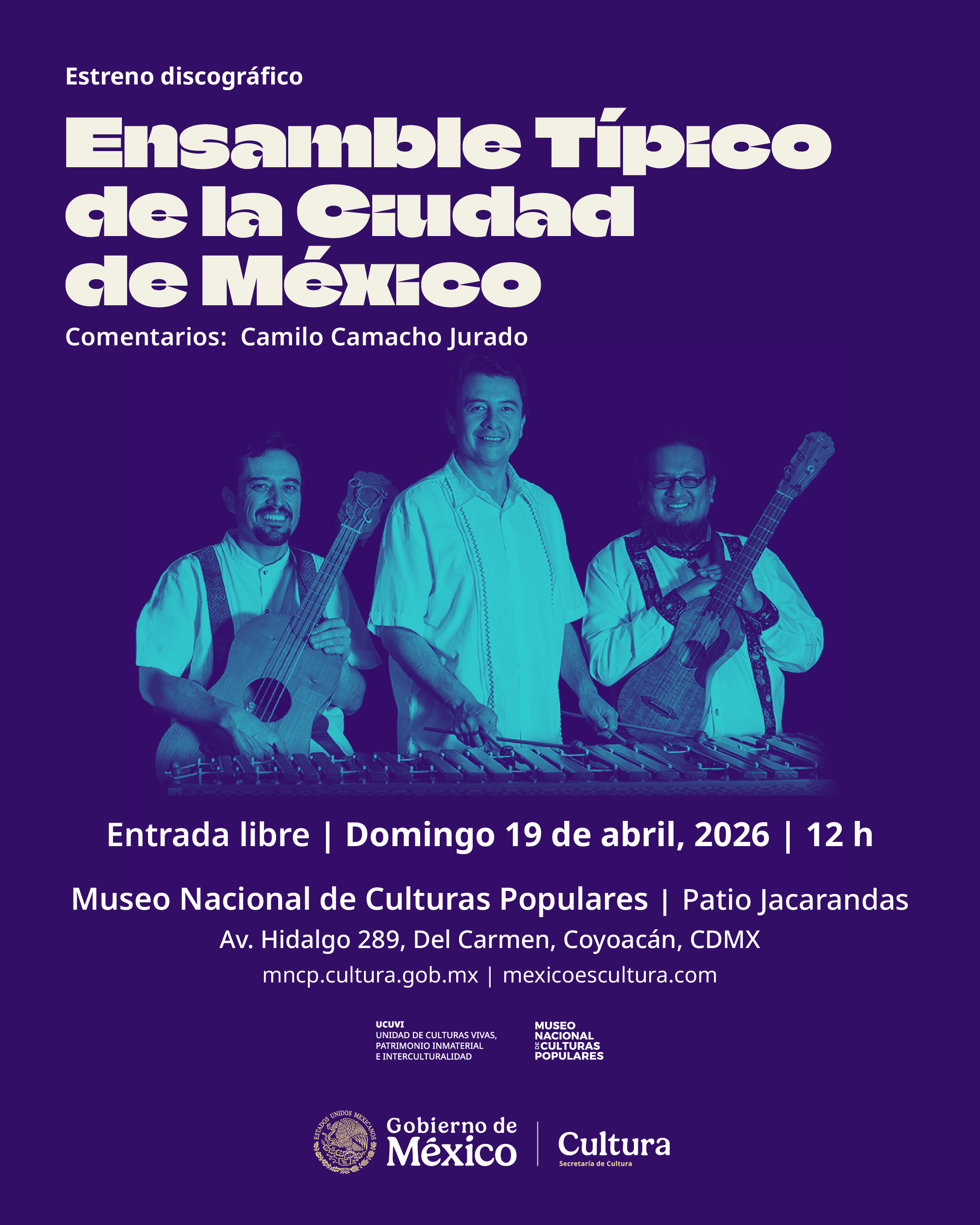 El domingo 19 de abril de 2026 a las 12:00 h, el Museo Nacional de Culturas Populares será sede de la presentación del material discográfico “Ensamble Típico”, a cargo del Ensamble Típico de la Ciudad de México, agrupación fundada en 2018 y dedicada a la difusión de la música mexicana de finales del siglo XIX y principios del XX.