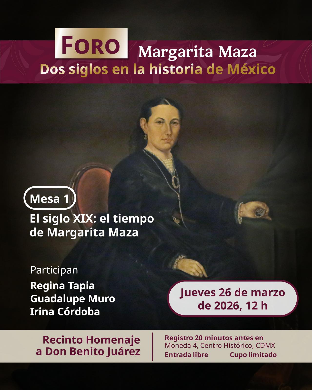 La Mesa 1, abordará "El siglo XIX: el tiempo de Margarita Maza", Regina Tapia Guadalupe Muro e Irina Córdoba ofrecerán una reflexión histórica tanto del papel que tuvo en su entorno, como de su formación educativa. Asimismo, analizarán las redes de protección y apoyo que la sostuvieron durante sus períodos de exilio.
