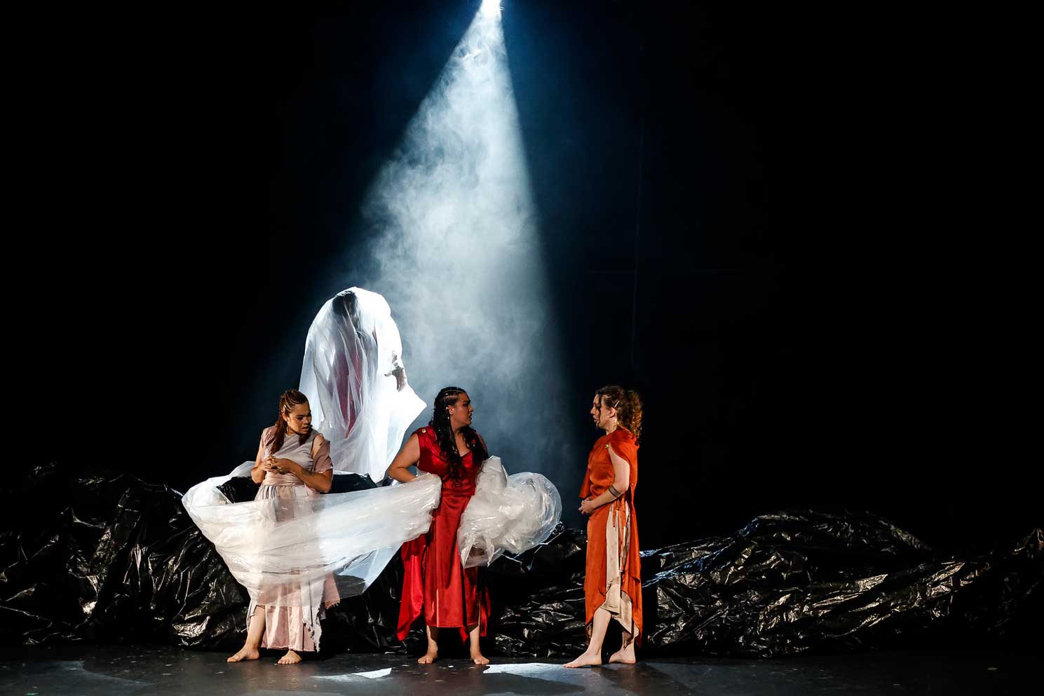 Troya ha caído. Entre escombros, Andrómaca intenta proteger la inocencia de un coro de niños mientras Cassandra predice un futuro oscuro. Helena, blanco del odio y deseo, busca sobrevivir. Una obra necesaria sobre la resistencia femenina y el vuelo final de las infancias rotas.